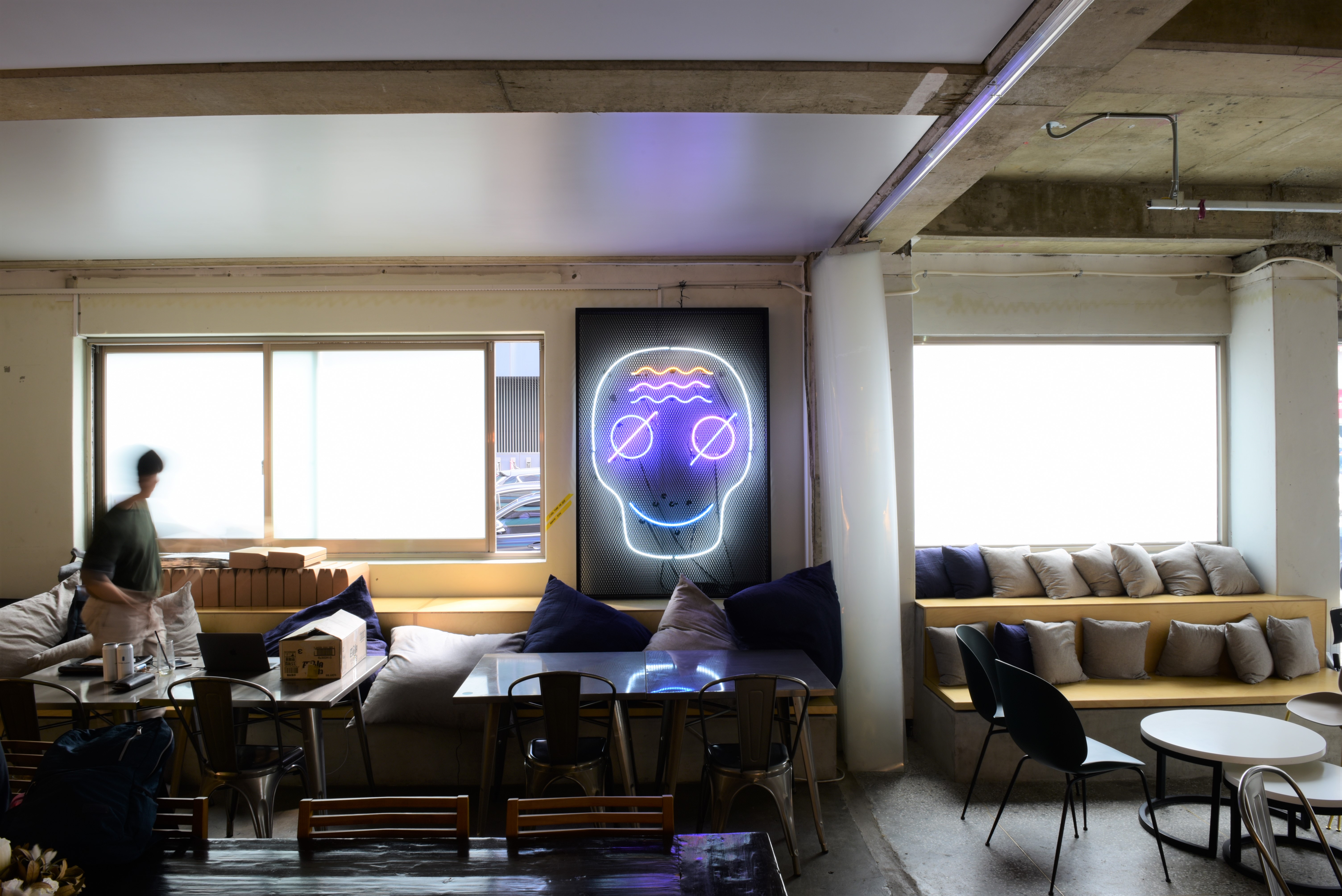 Cornered in one of the biggest intersections right in between Seongsu and Kunkuk Univ. Station, Punto Blu invites you to wind down with the scent of coffee, comforting cushions, selections of whisky, and artworks that will lead you to open up your mind and conversations with others.